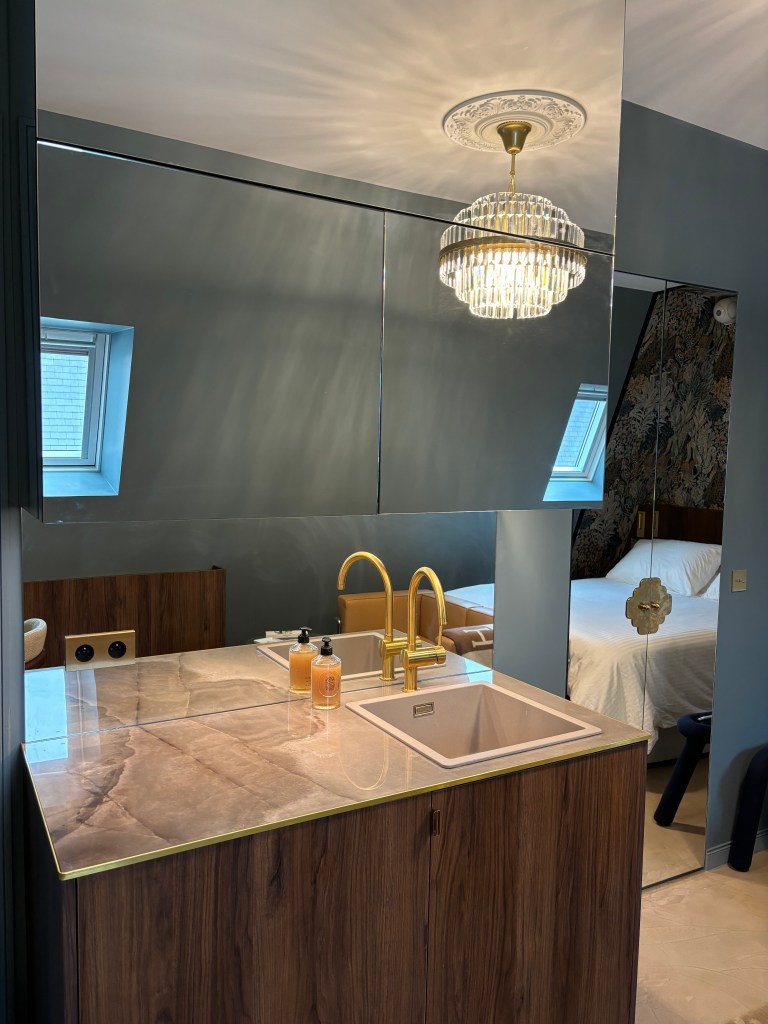 Dans la pièce principale, le projet s’est appuyé sur un travail précis des perspectives et de la lumière. Les miroirs ont été intégrés aux placards hauts de la cuisine afin les dissimuler, à la bibliothèque sur mesure en tête de lit , ainsi qu’à l’accès de la salle de bain par une double porte miroir, apportant profondeur et luminosité à l’espace.