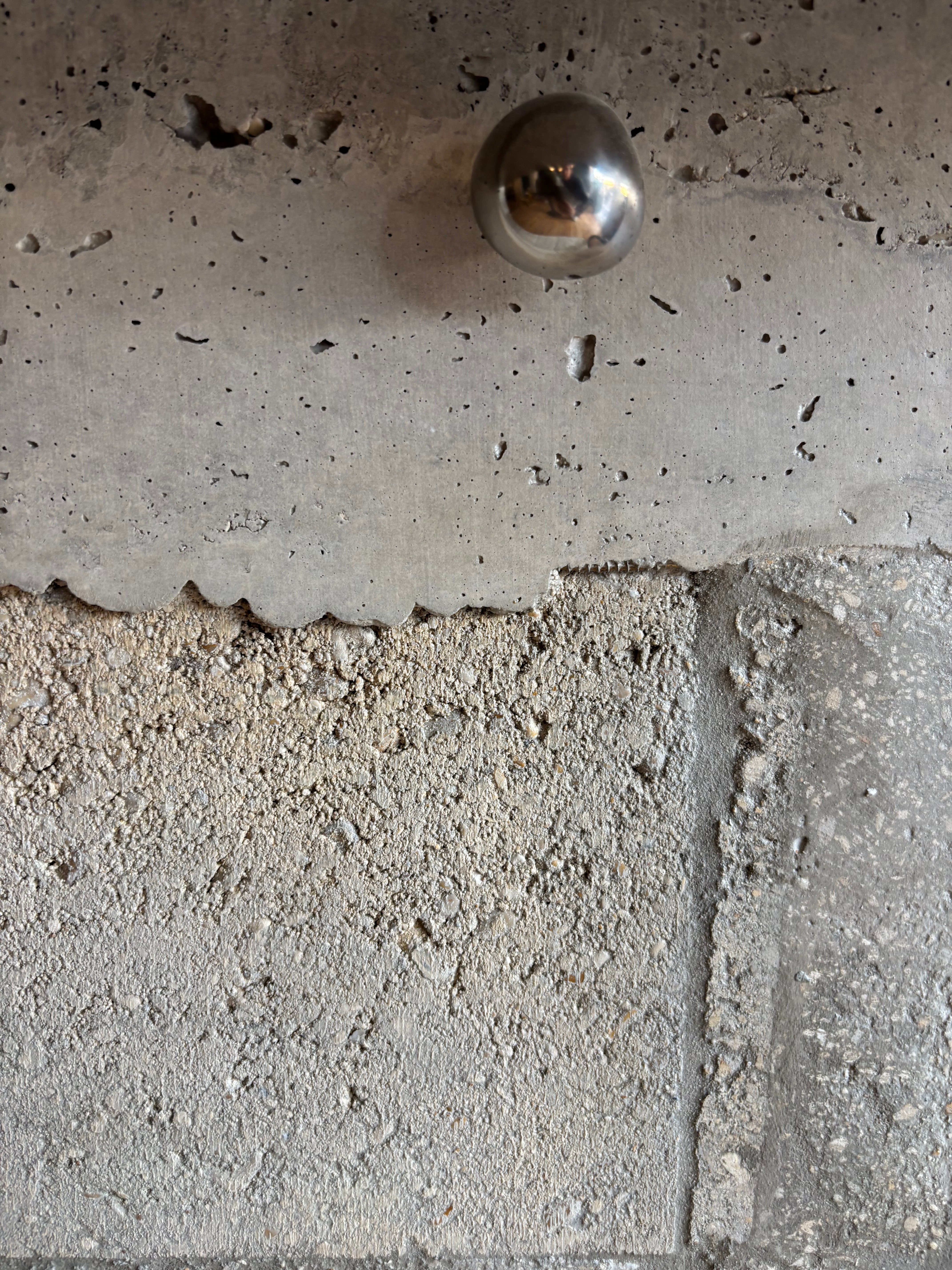 L’espace, étroit et structuré par une succession d’estrades, se déploie sur trois niveaux. Cette configuration a nécessité une refonte complète du bar, pensé comme un élément central du lieu. Un comptoir en parpaings et béton a été réalisé, accompagné d’un banc suspendu en béton. Les tabourets de bar ont été dessinés et réalisés à la main par un designer, en métal brut, prolongeant cette écriture franche et artisanale.