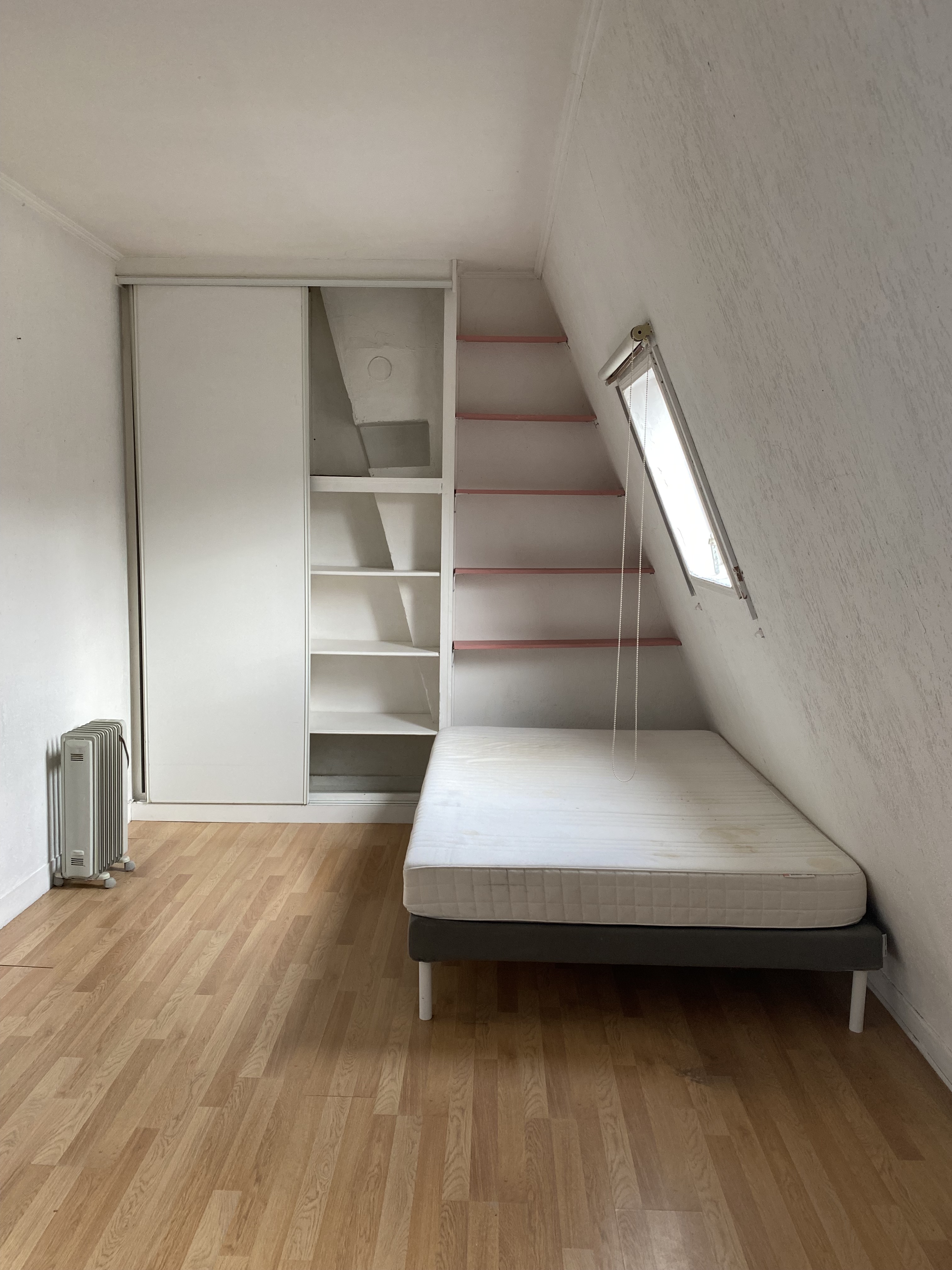 Ce studio sous les toits d’environ 20 m², initialement en très mauvais état et dépourvu d’isolation, a fait l’objet d’une rénovation complète.